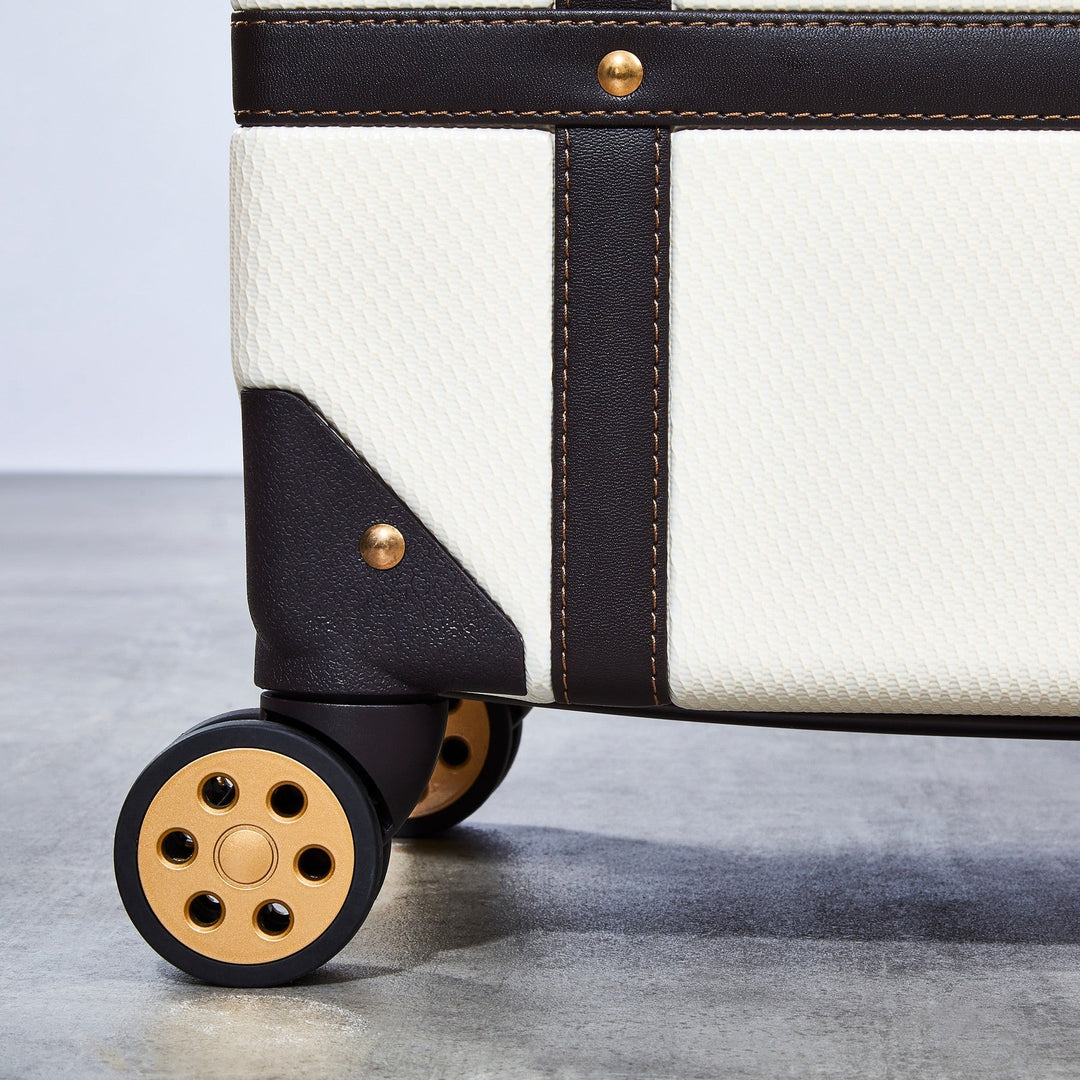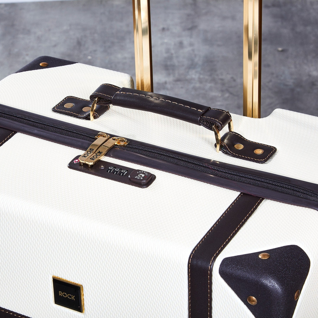 Rock luggage surpasses the known and ordinary with its classic vintage-looking style, stageless wheel handle. The use of outspoken, delicate materials, exquisite detailing and the varied color palette make this range desirable for all be the center of attention with this iconic trunk style suitcase.