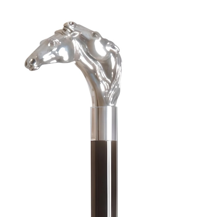 The Classic Canes Two Horses Formal Cane is a delightful and sophisticated walking accessory that blends functionality with a sense of elegance. This charming cane features the heads of two spirited horses, which are silver plated and bear the European hallmark 'R925', denoting high-quality silver overlay on a moulded head.
