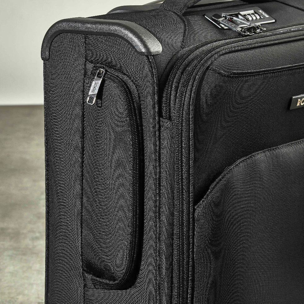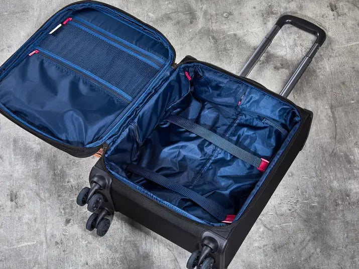 The cabin suitcase has a side pocket to store liquids and belongings for easy access at the airport.