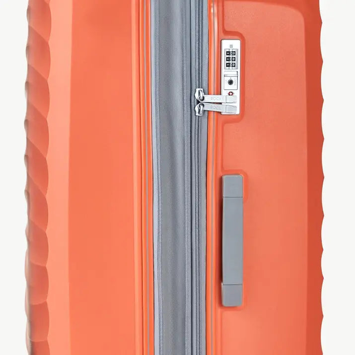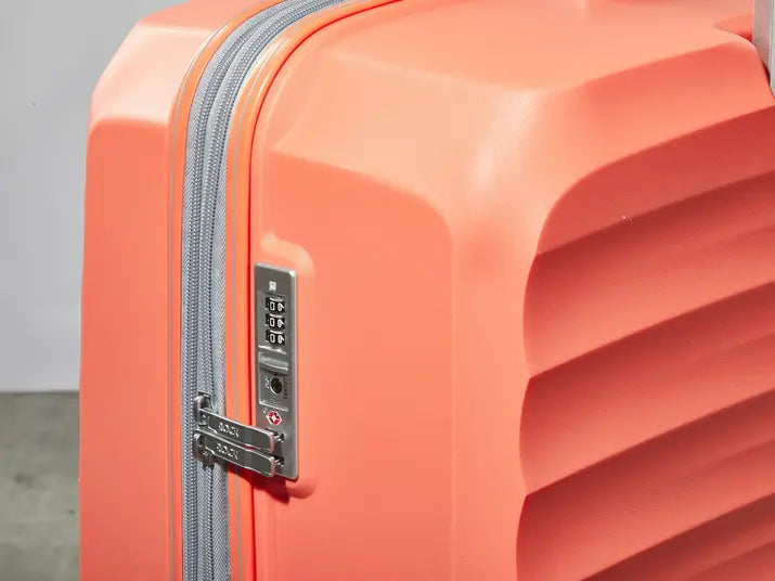 Introducing the Rock Sunwave Expandable Hardshell Cabin Suitcase, a superhero of luggage designed with ultra-strong polypropylene, offering durability and impact resistance. With a 15-year manufacturer's warranty, this suitcase is built to last. Its expandable feature provides maximum storage capacity, and the 8 smooth rolling wheels and telescopic push-button handle ensure effortless travels. For your security, the Sunwave case is fitted with an integrated Travel Sentry-approved TSA combination lock.